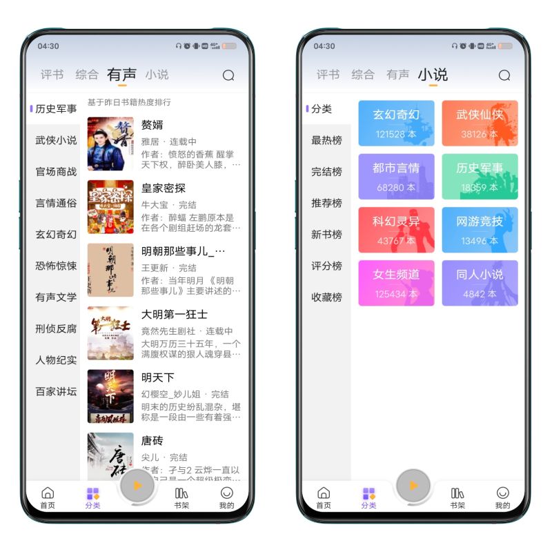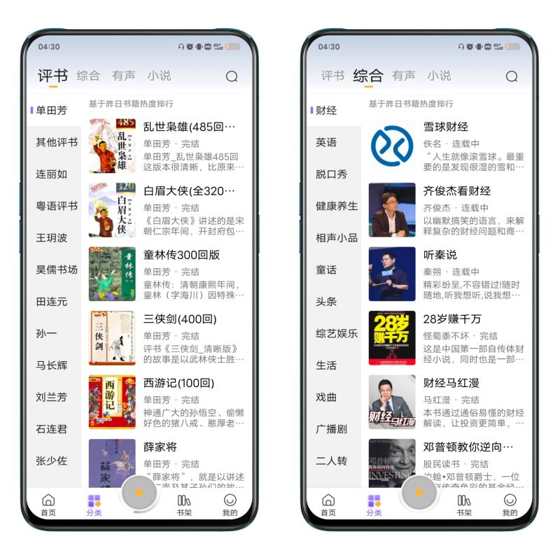 分类包括:评书,综合,有声,小说。每一类细分类型都非常详细,完全不愁书荒,有声书音质清晰,引人入胜,支持在线缓存,跳过头尾,定时关闭,语速设置。